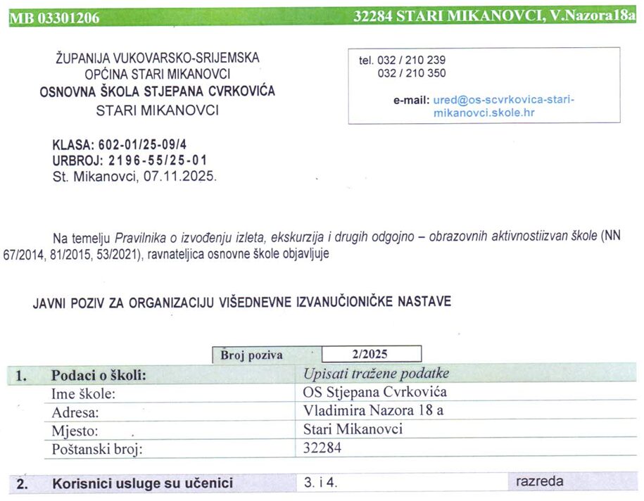 Javni poziv za organizaciju višednevne izvanučioničke nastave 3. i 4. razred