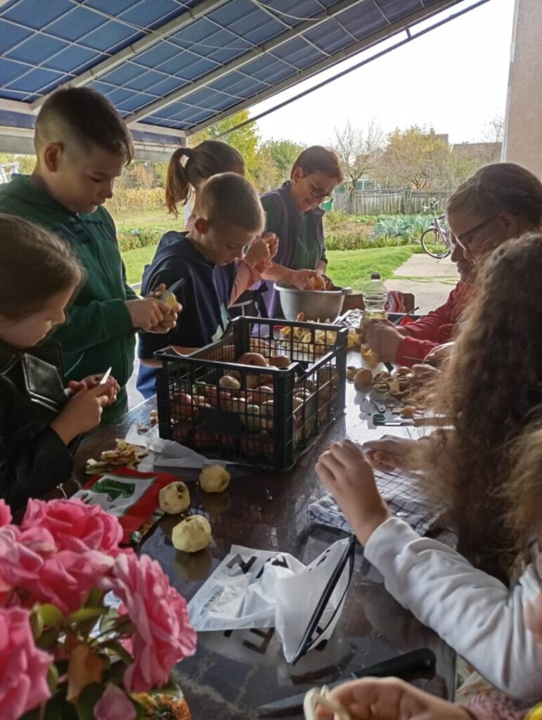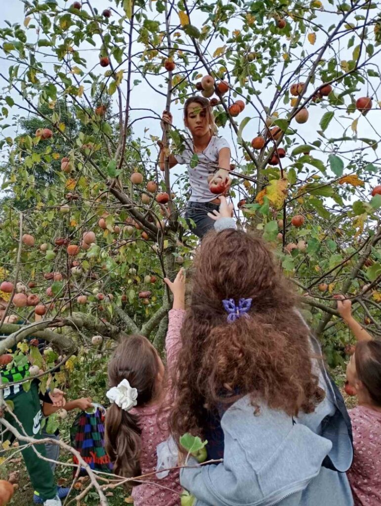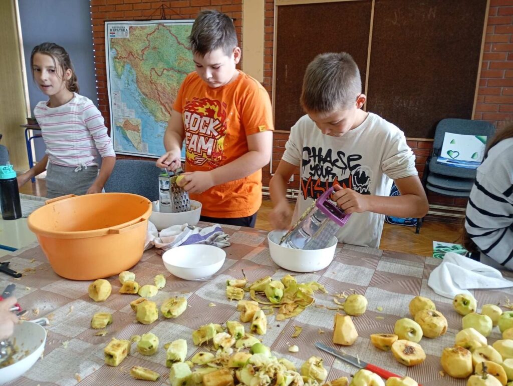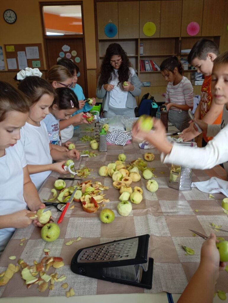 Nedugo zatim obilježili smo Dan jabuka. Jabuka, kraljica voća, zaslužila je poseban dan! Prisjetili smo se poznate izreke: „Jedna jabuka na dan, doktora iz kuće van.“ Krenuli smo u berbu jabuka u našem školskom voćnjaku, a zatim smo ih gulili, ribali i pripremali ukusnu štrudlu od jabuka te sok od jabuka.