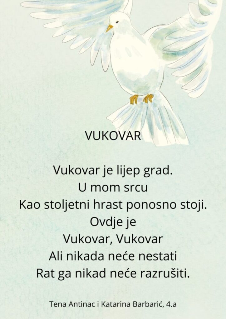Povodom Dana sjećanja na žrtvu Vukovara, 18. studenoga, učenici 4.a razreda sudjelovali su u kratkom literarnom zadatku stvaranja pjesama posvećenih Gradu Heroju.